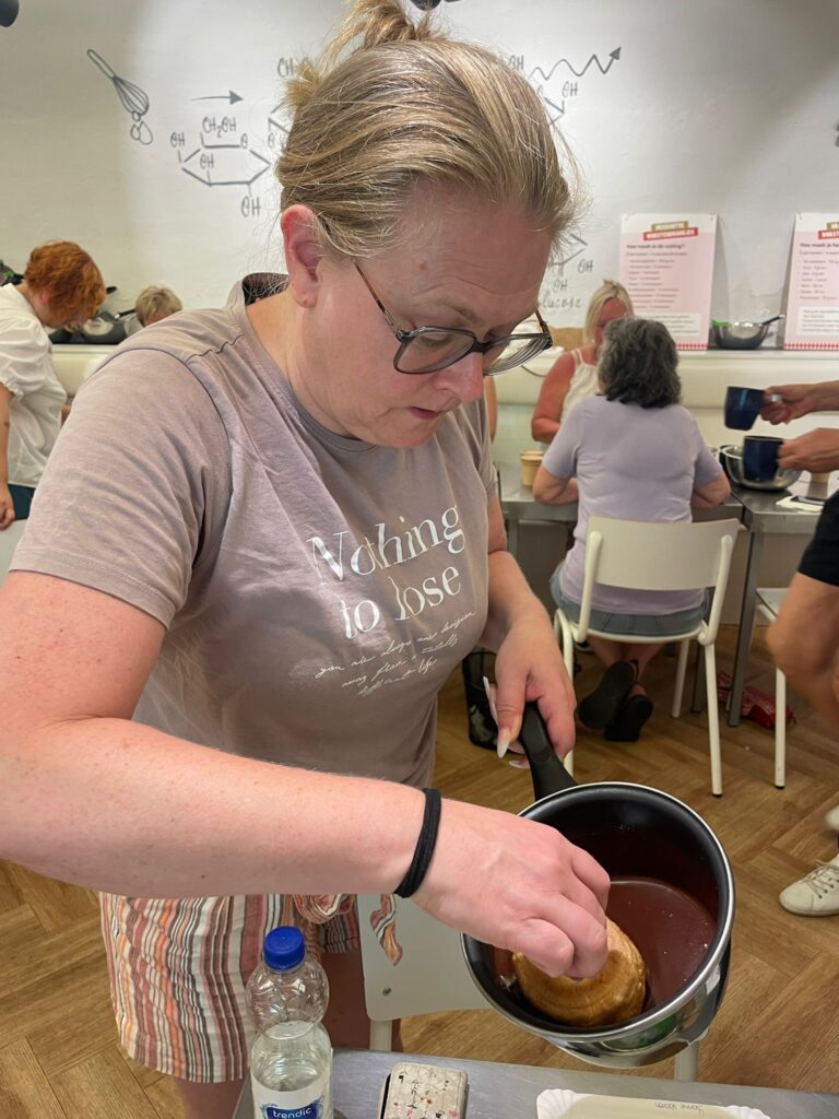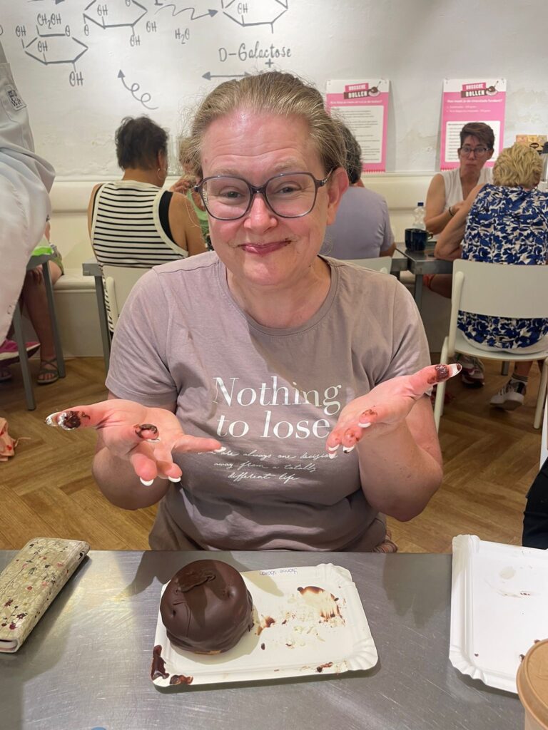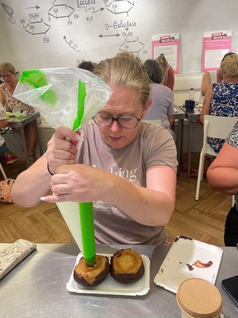 De quizavond bracht zoveel gelach en geklets — we werden willekeurig in teams verdeeld, en het voelde alsof we elkaar al jaren kenden. Muziekvragen, weetjes over de omgeving, de camping en de organisatie… onze groep eindigde als derde, maar het plezier was goud waard. Ook de fietstocht naar Den Bosch met zes vrouwen van het tentenveld was heerlijk. Tijdens het Bossche bollen maken werd er gelachen en gesnoept, en de middag op het terras voelde als pure ontspanning. Ik heb me in jaren niet zó vermaakt — alleen met meiden op pad.